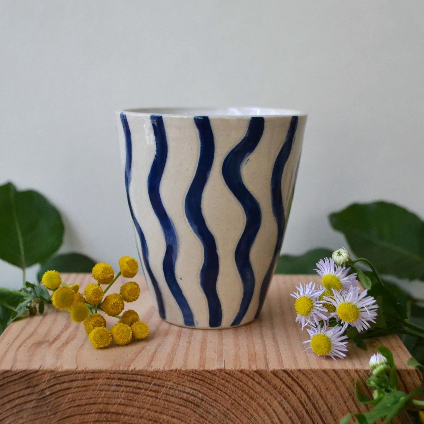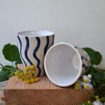 Czarka wykonana z jasnej gliny. Ozdobiona niebieskimi paskami i pokryta transparentnym szkliwem.
