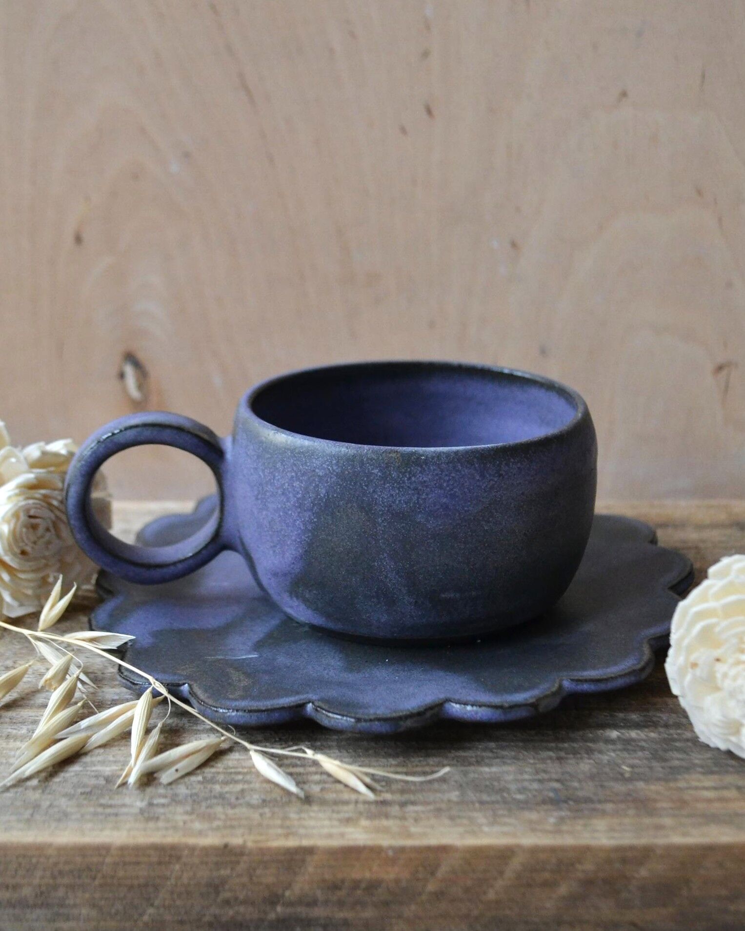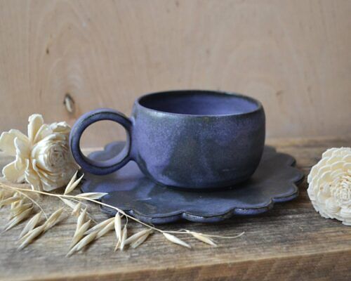 Kubek wytoczony na kole garncarskim z czarnej gliny, pokryty fioletowym matowym szkliwem ze złotymi przebarwieniami.