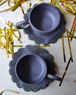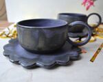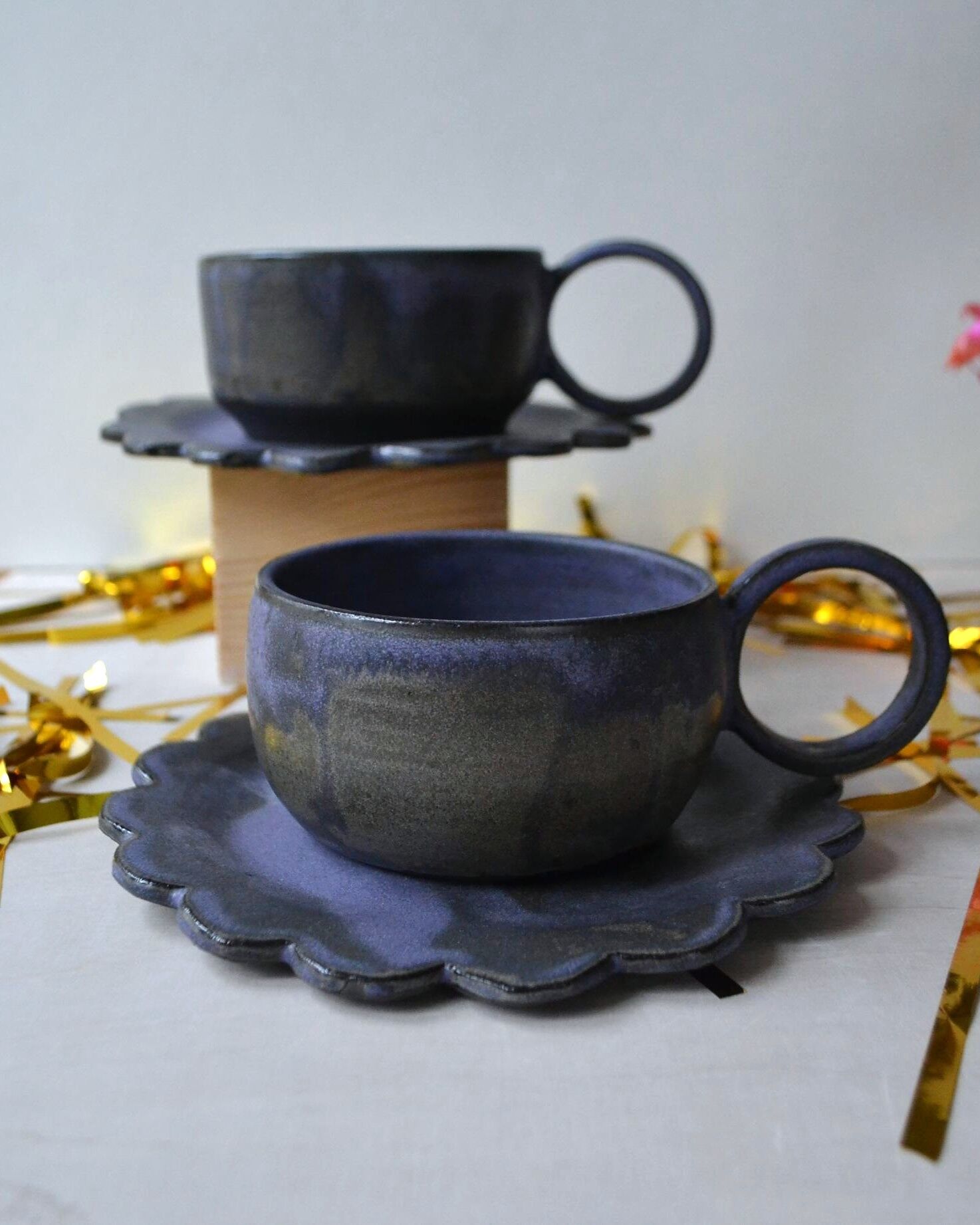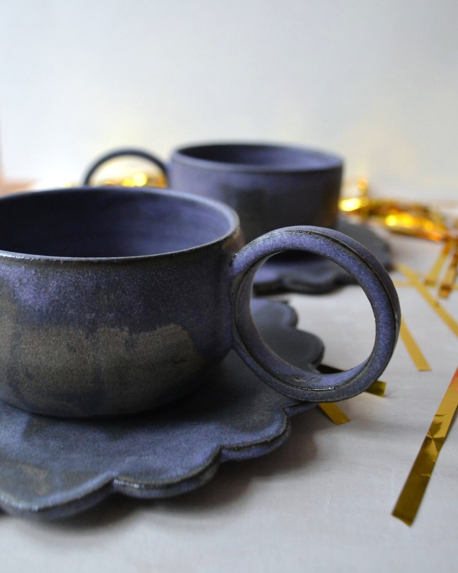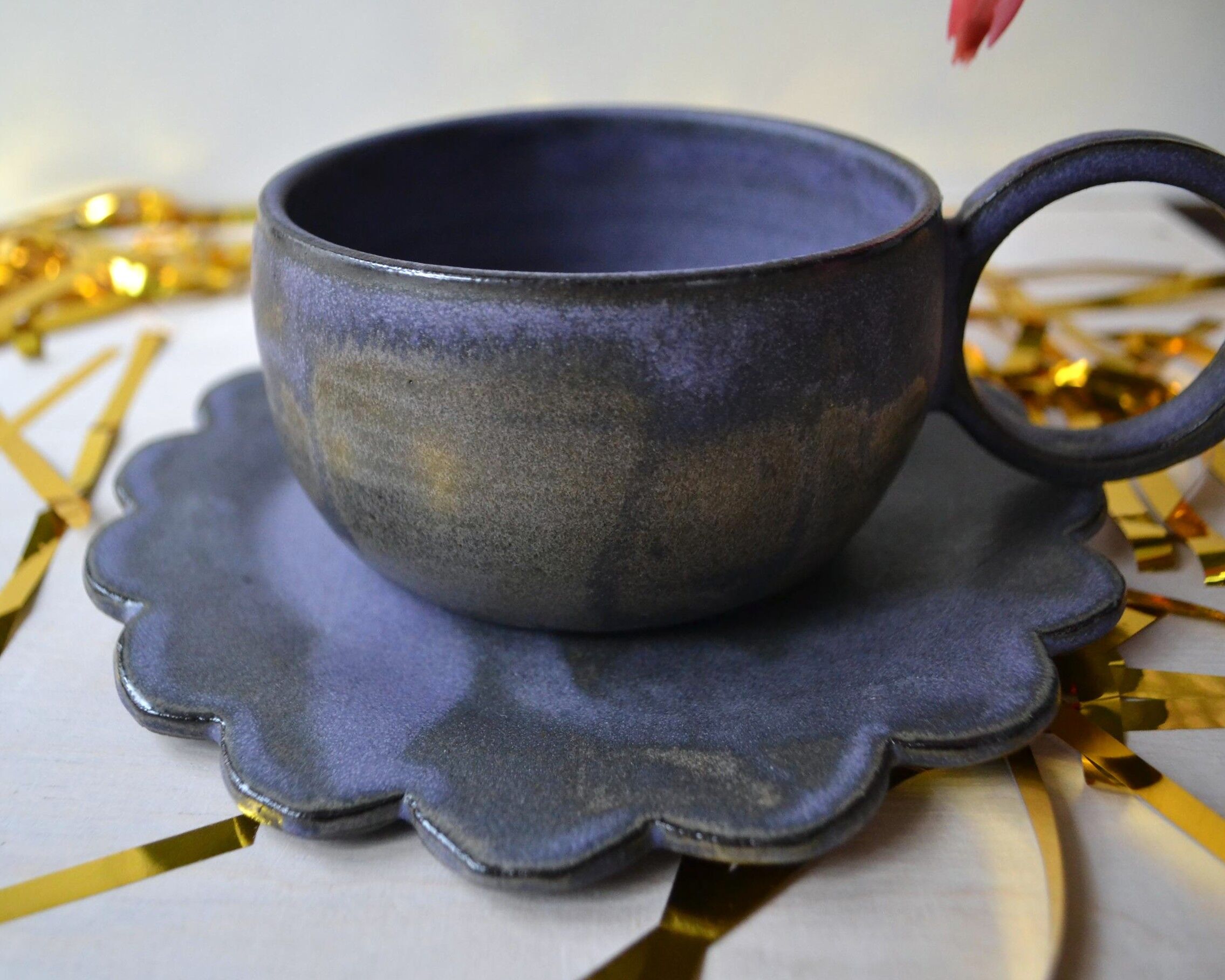 Kubek wytoczony na kole garncarskim z czarnej gliny, pokryty fioletowym matowym szkliwem ze złotymi przebarwieniami.