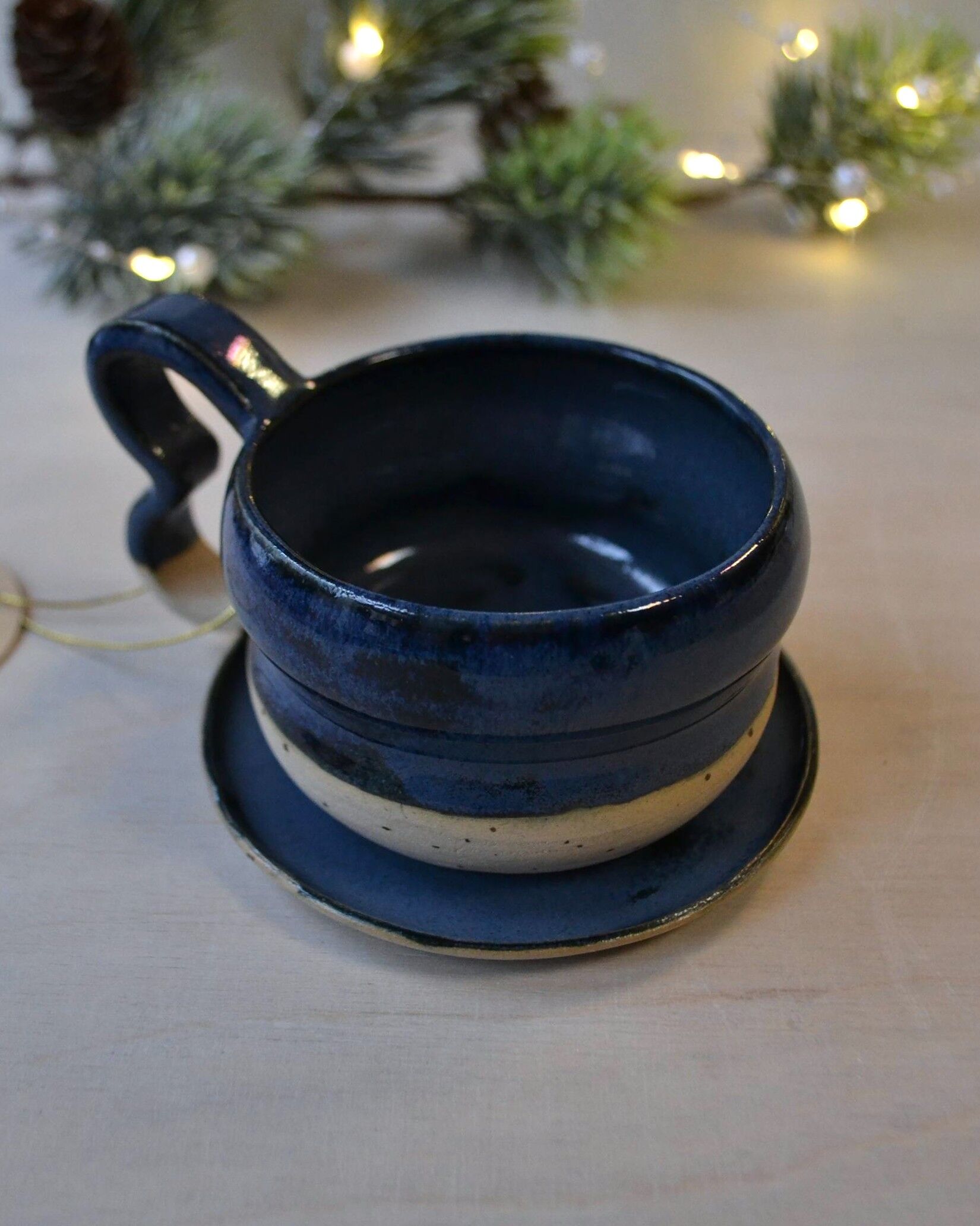 Zestaw wytoczony na kole garncarskim z jasnej gliny w kropki, pokryty granatowym szkliwem.