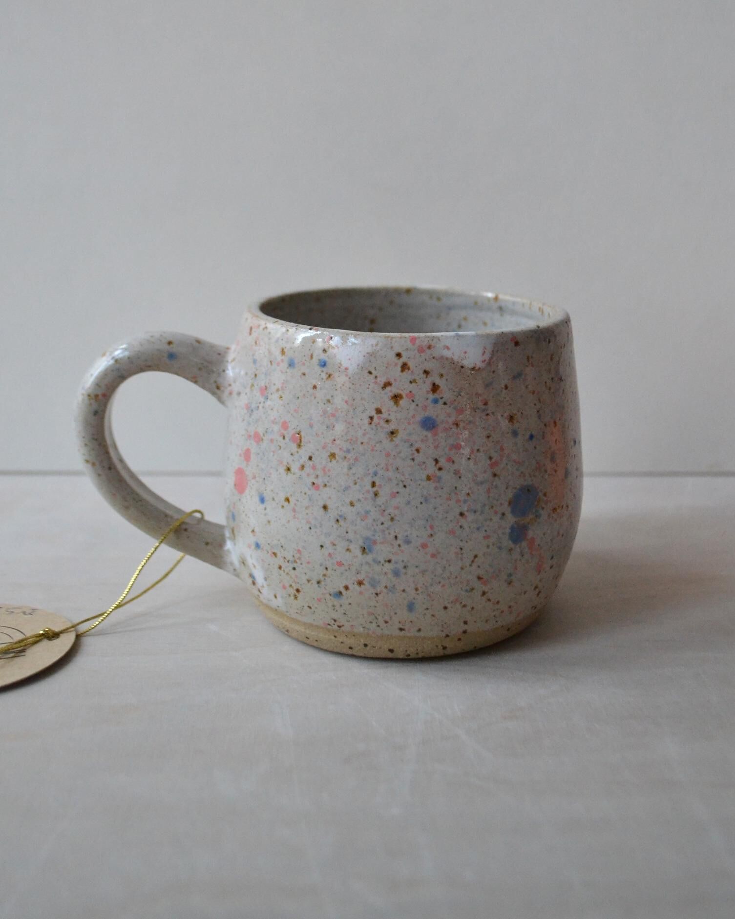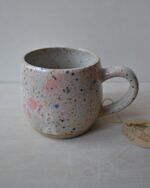 Kubek wytoczony na kole garncarskim z jasnej gliny, pokryty jasnym szkliwem w kropki.