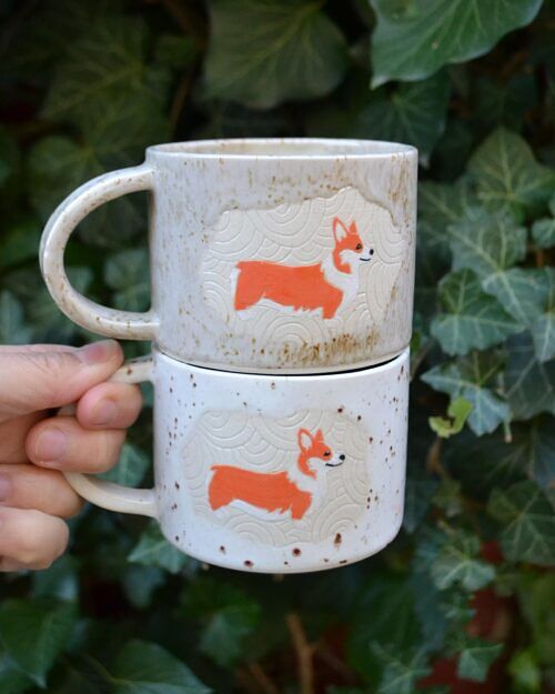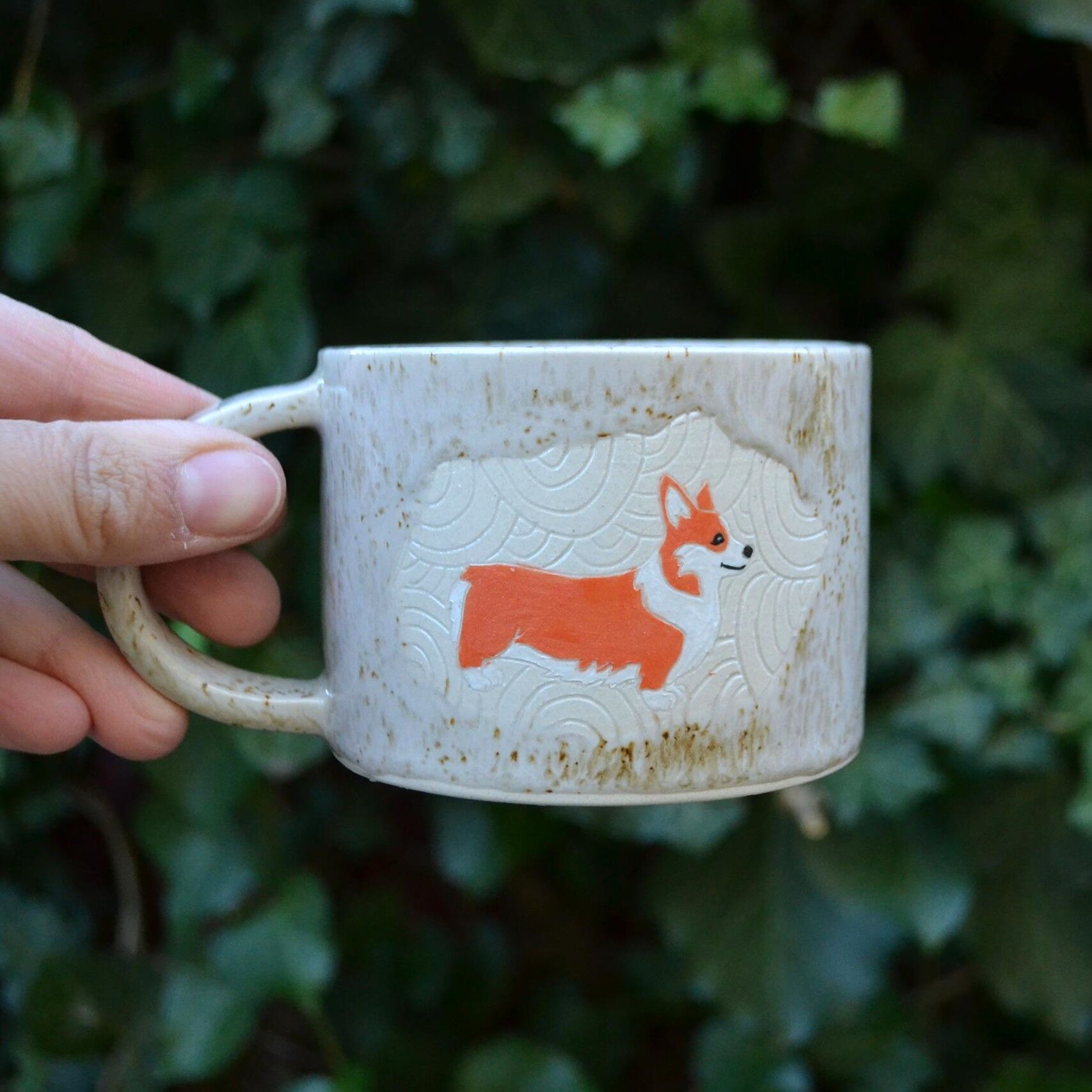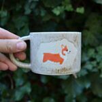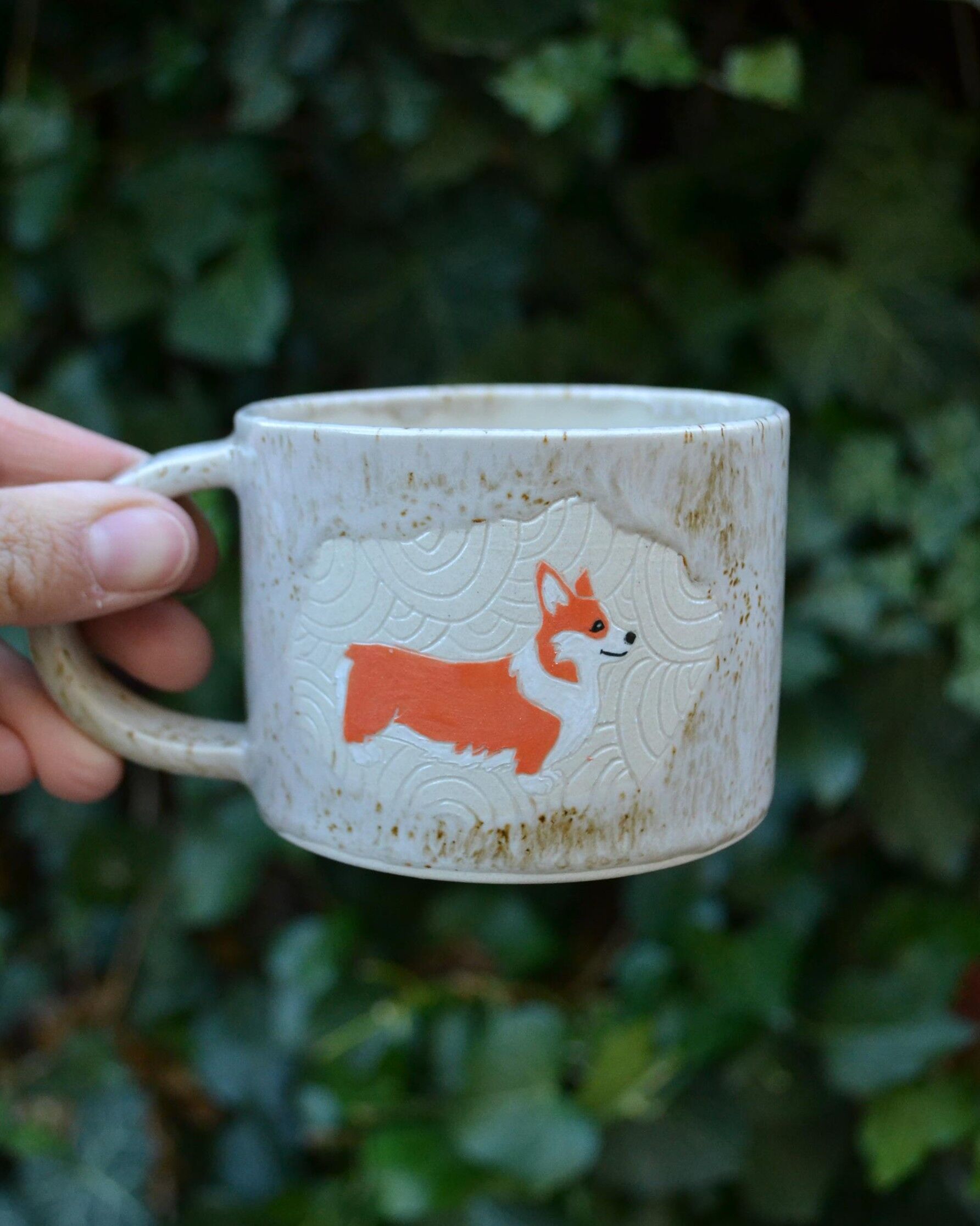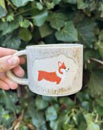 Ręcznie wykonany kubek z wizerunkiem psa, zdobiony techniką sgraffito na mokrej glinie. Pokryty piaskowym, nakrapianym szkliwem.