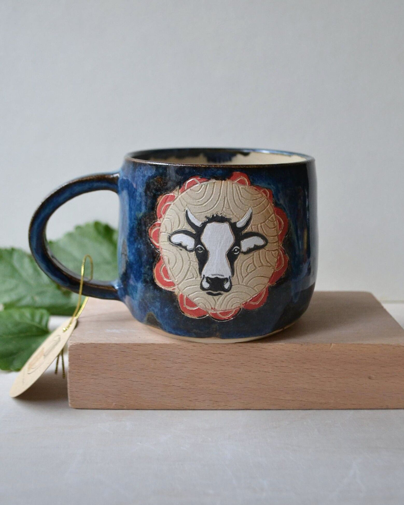 Kubek z wizerunkiem krowy, wytoczony na kole garncarskim z jasnej gliny, pokryty ciemnym niebieskim szkliwem. Rysunek kury wykonany ręcznie, w technice sgraffito.