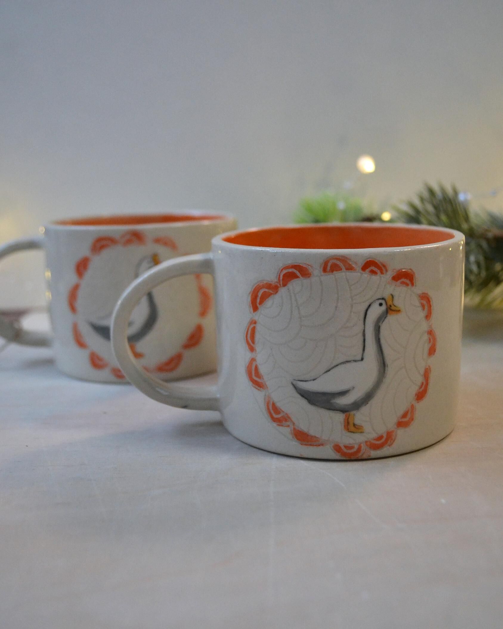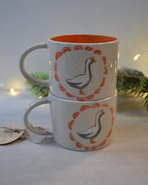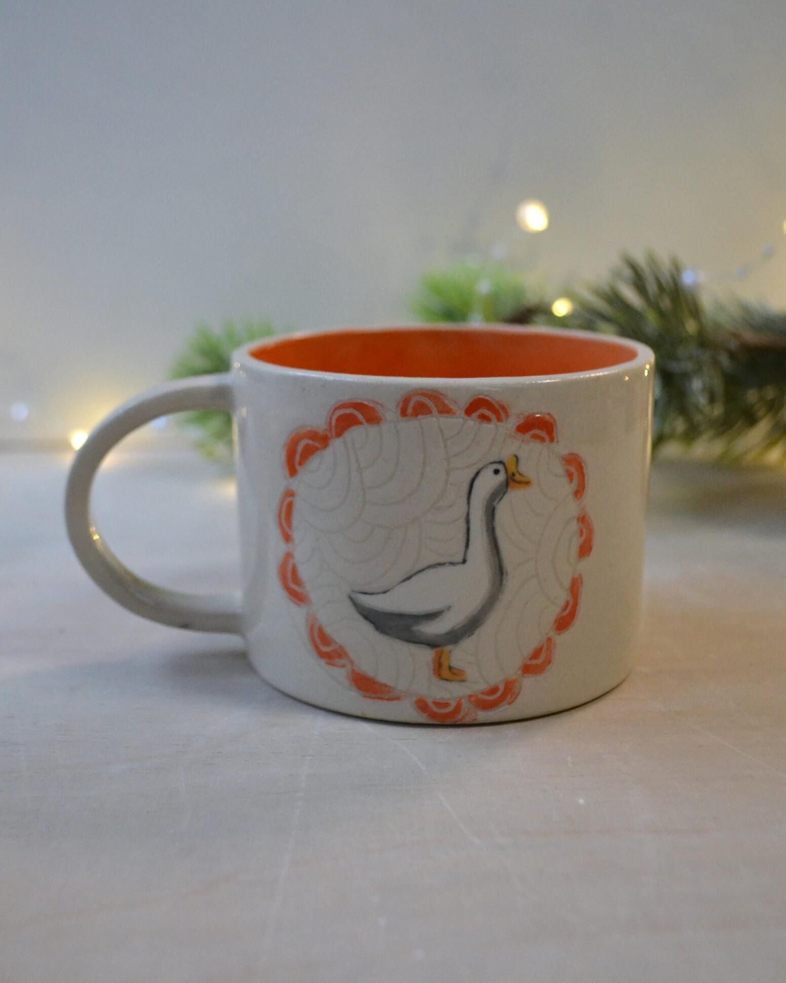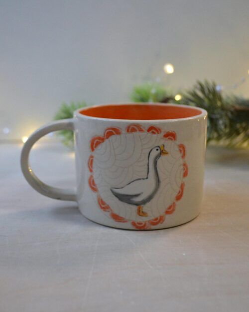 Kubek z Gąską, wykonany z jasnej gliny. Wzór na kubku wykonany jest w technice sgraffito. Pokryty transparentnym szkliwem na zewnątrz i pomarańczowym w środku.