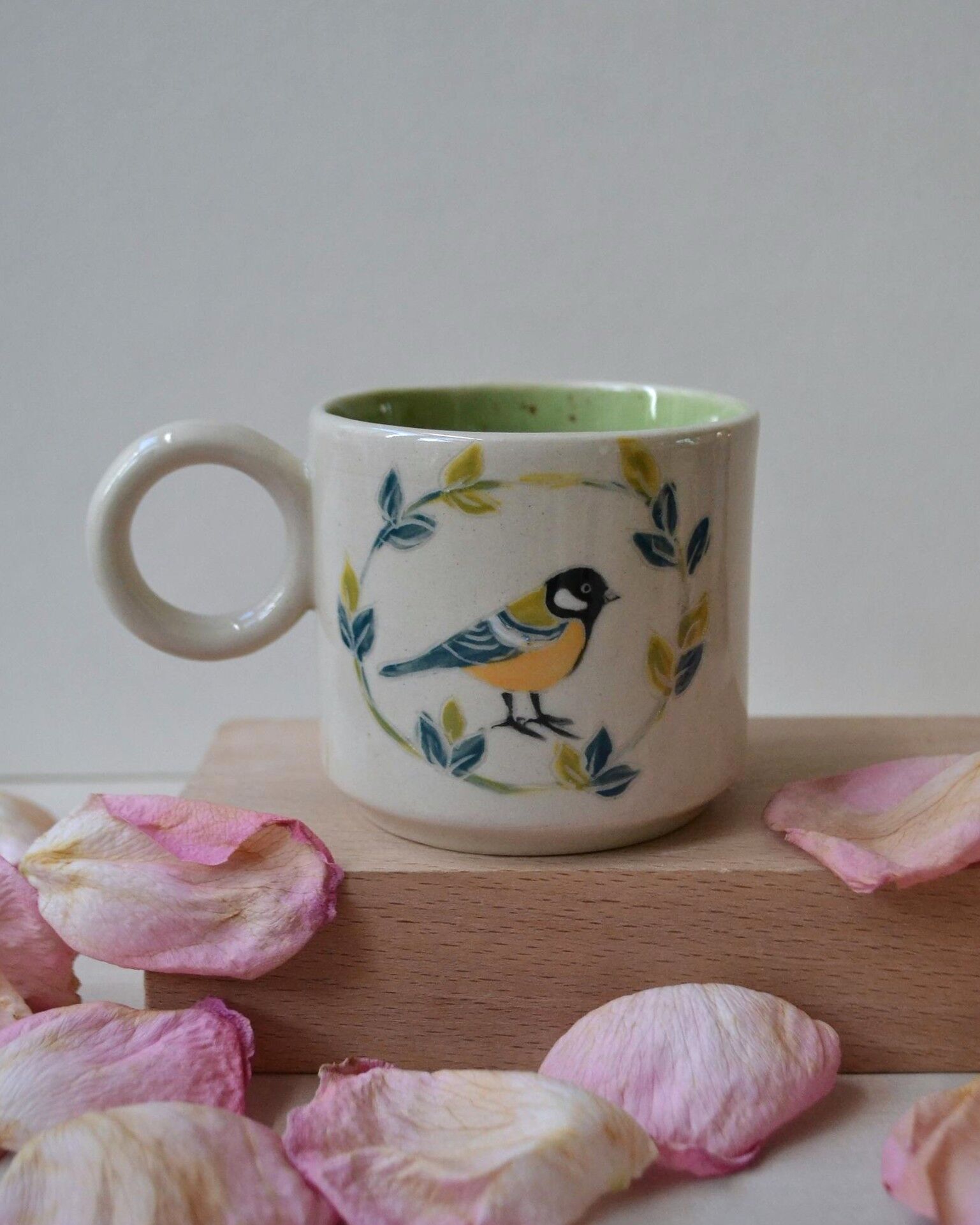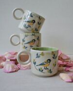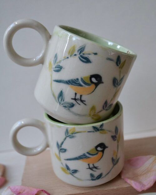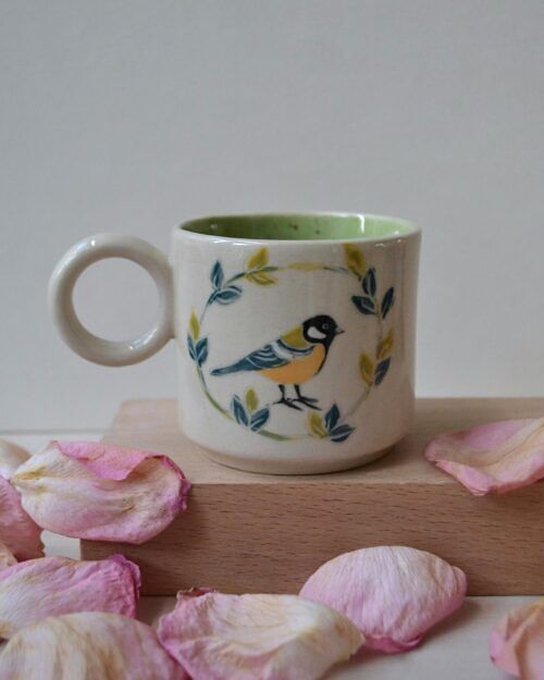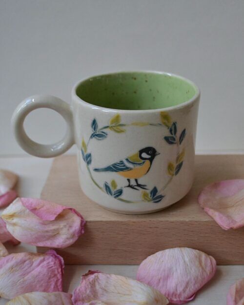 Kubek z sikorką, wykonany z jasnej gliny. Wzór na kubku wykonany jest w technice sgraffito. Pokryty transparentnym szkliwem na zewnątrz i zielonym nakrapianym w środku.
