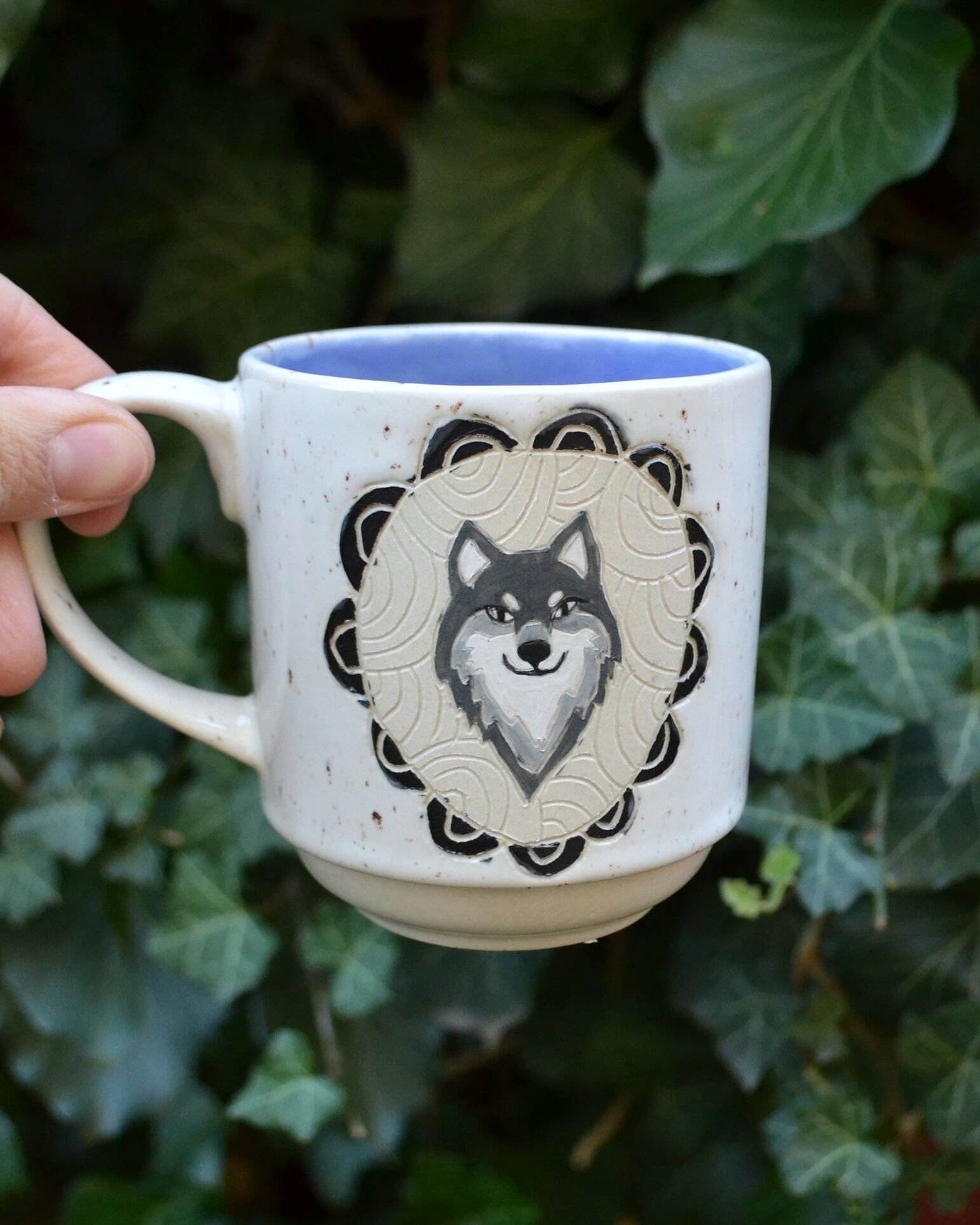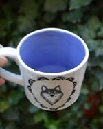 Ręcznie wykonany kubek z wizerunkiem psa, zdobiony techniką sgraffito na mokrej glinie. Pokryty białym nakrapianym szkliwem na zewewnątrz, niebieskim wewnatrz.