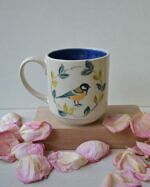Kubek z kurą, wykonany z jasnej gliny. Wzór na kubku wykonany ręcznie w technice sgraffito. Pokryty transparentnym szkliwem, wewnątrz kobaltowy.