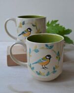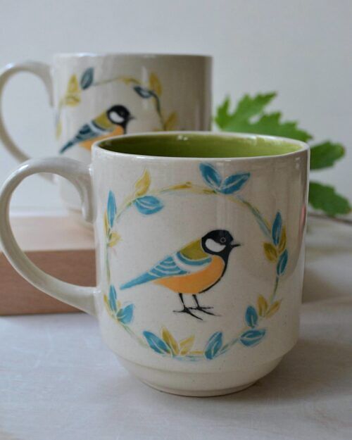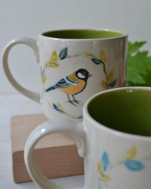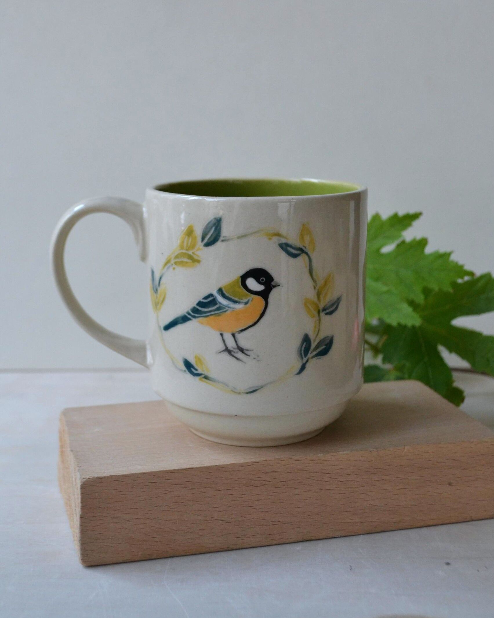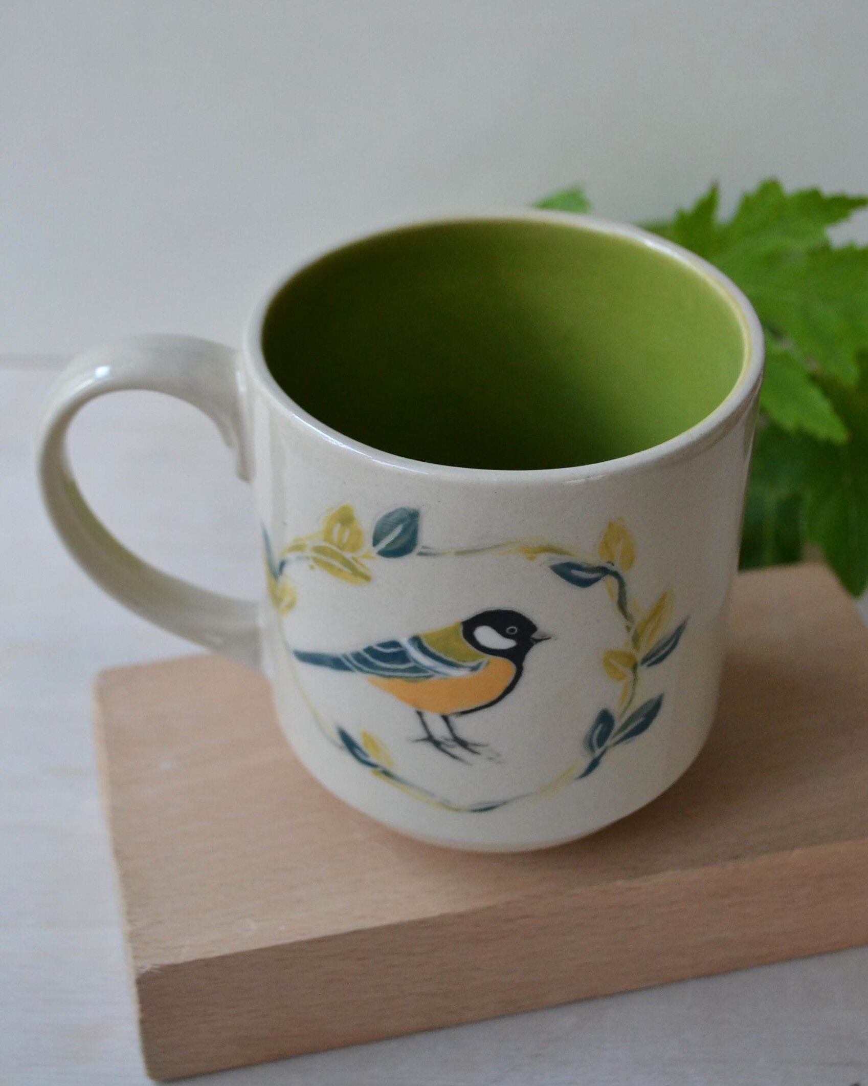 Kubek z kurą, wykonany z jasnej gliny. Wzór na kubku wykonany w technice sgraffito. Pokryty transparentnym szkliwem, wewnątrz zielonym.
