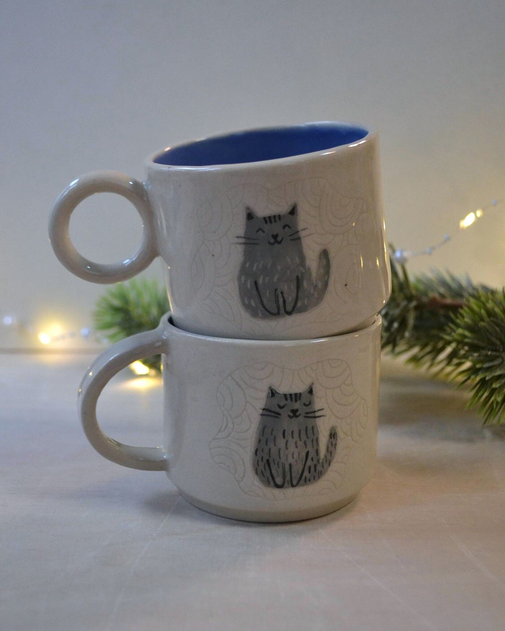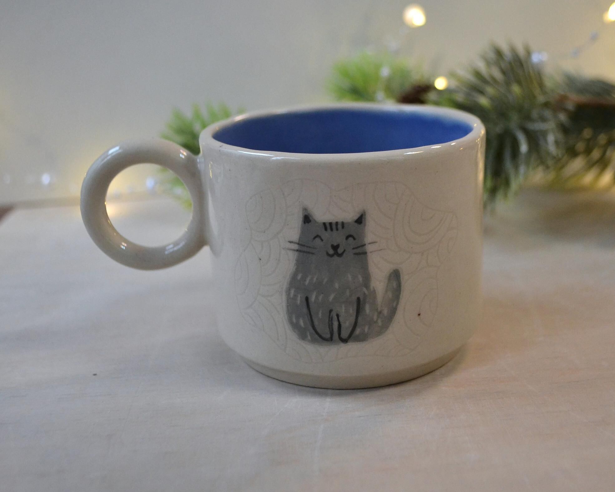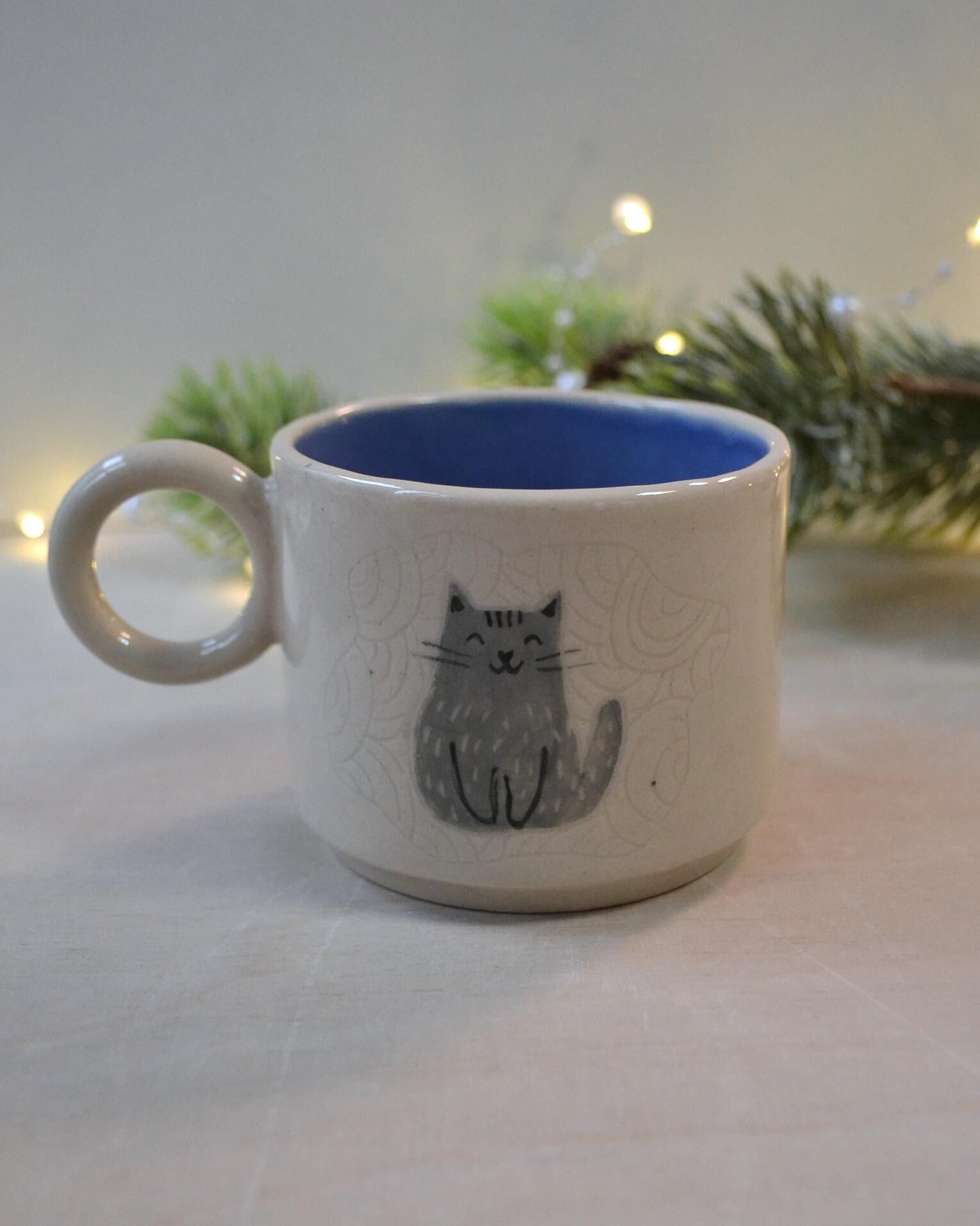 Kubek wykonany z jasnej gliny. Wzór kota na kubku wykonany jest w technice sgraffito.