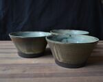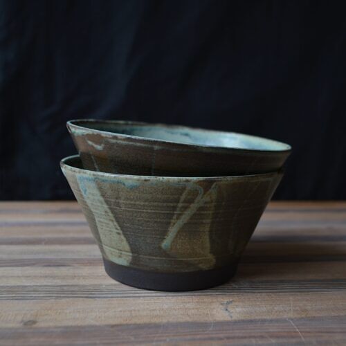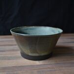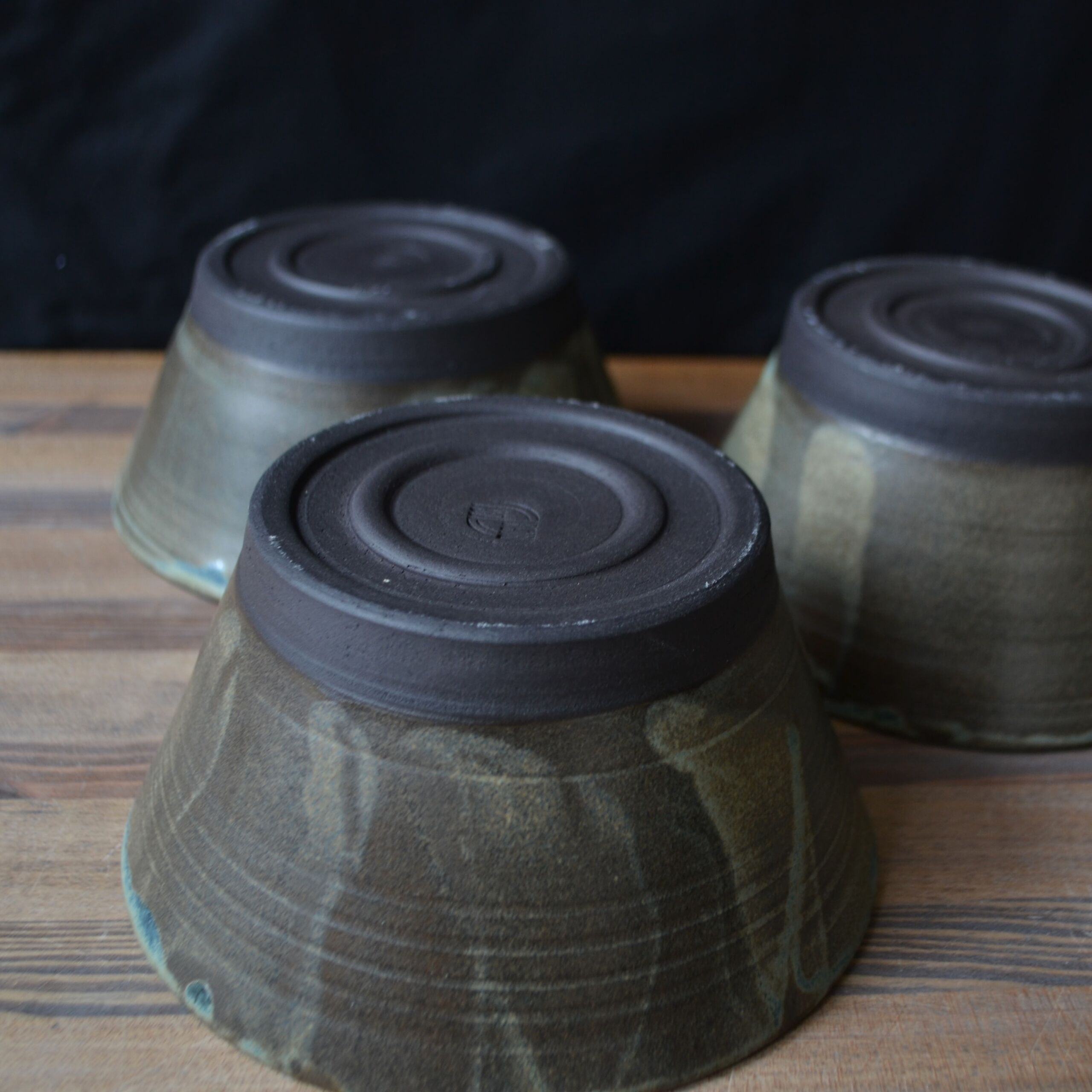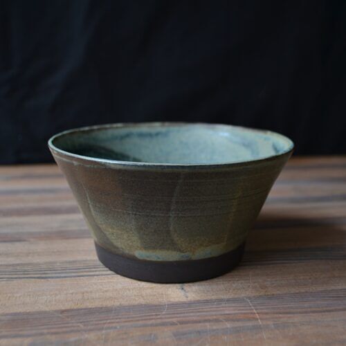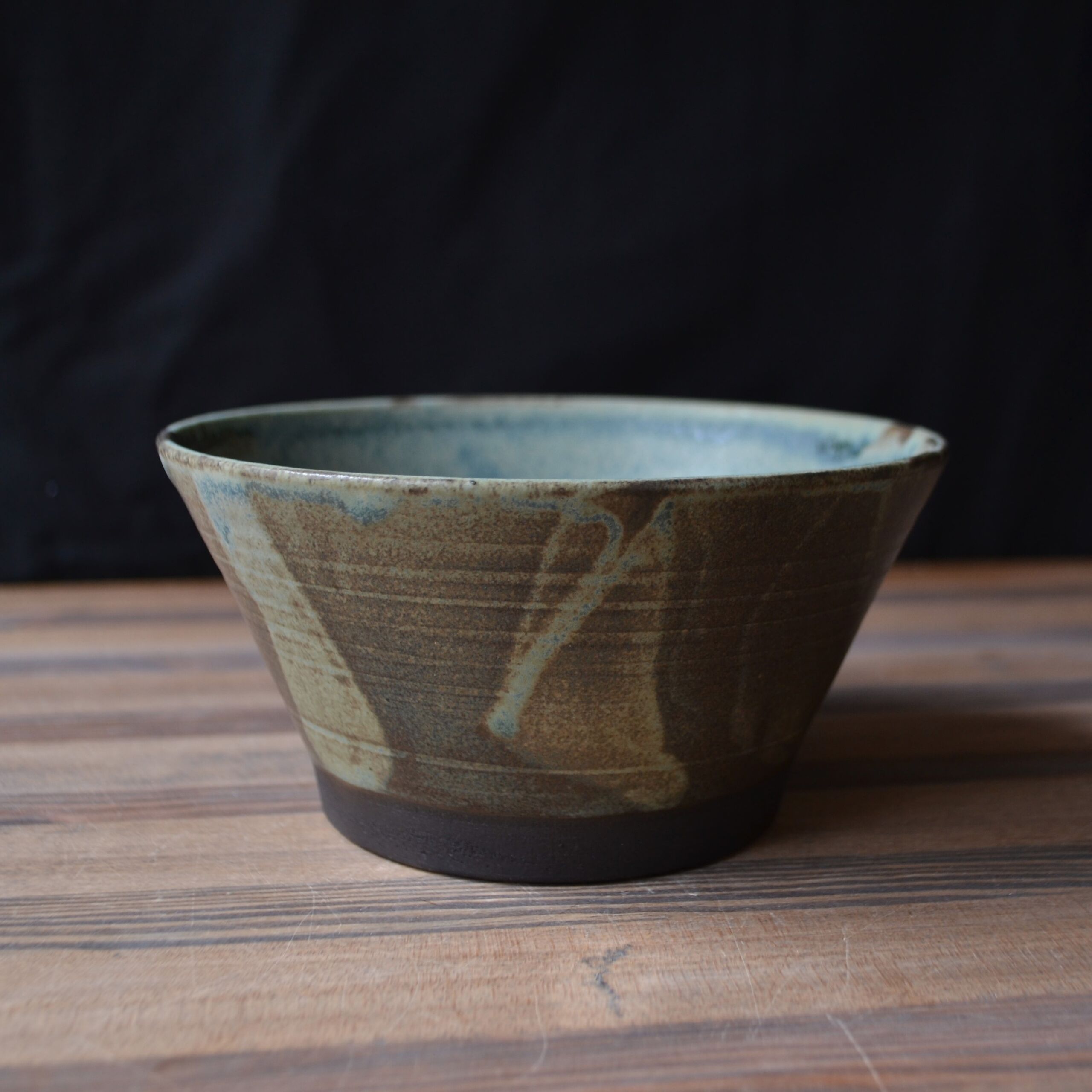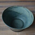 Miska wytoczona na kole garncarskim z czarnej gliny. Pokryta niebieskim szkliwem z brązowymi przebarwieniami.
