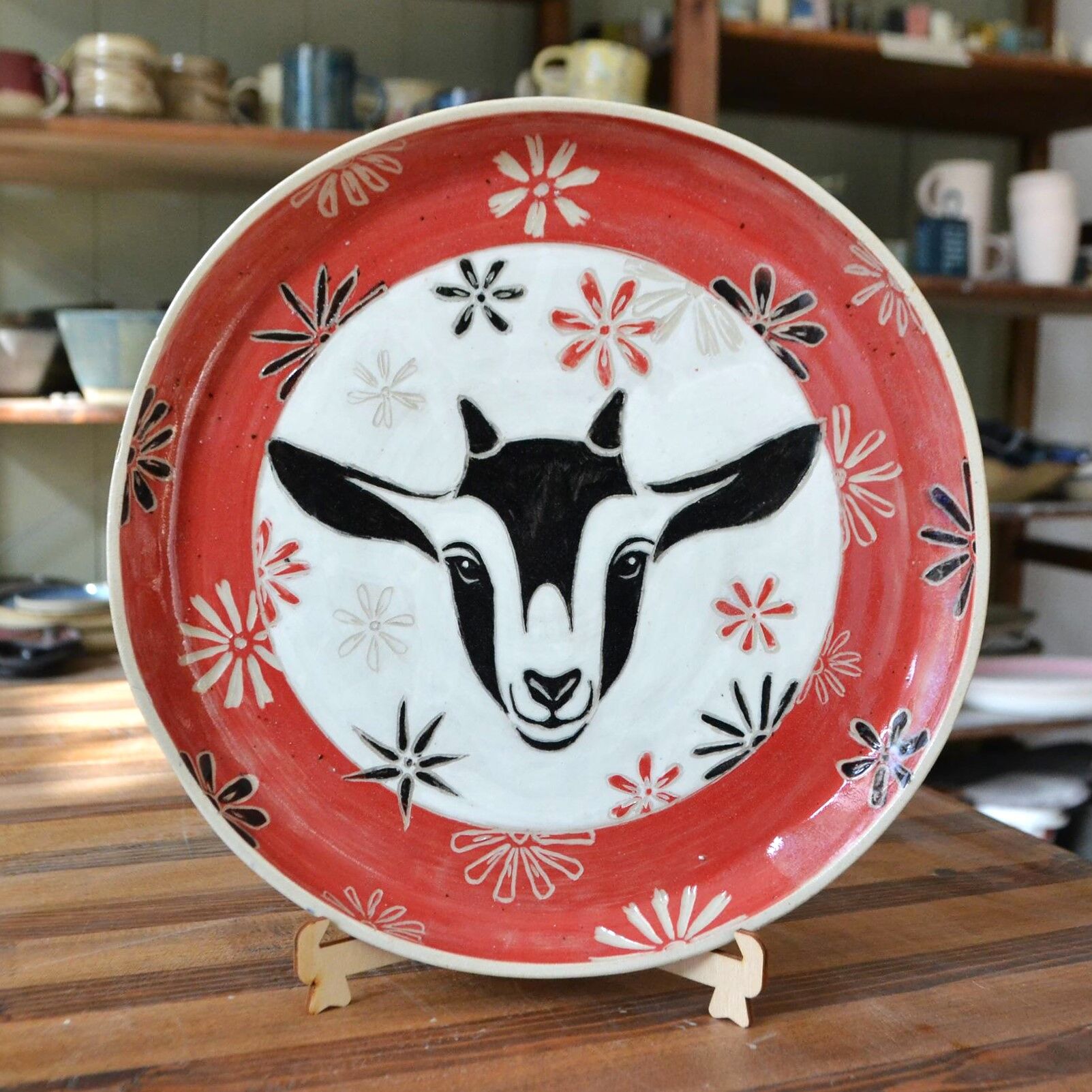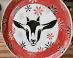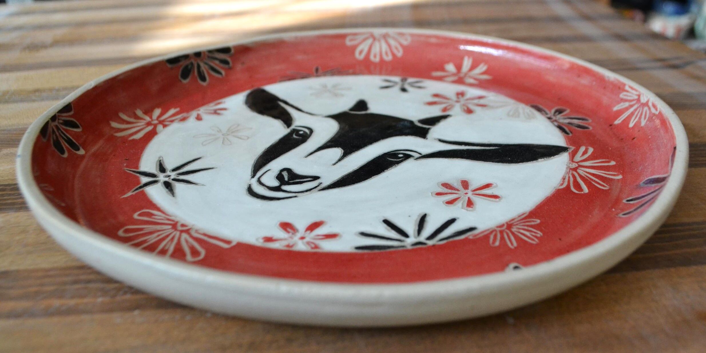 Patera/ talerz wytoczona na kole garncarskim. Ozdobiona w technice sgraffito. Pokryta bezbarwnym szkliwem.