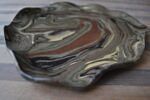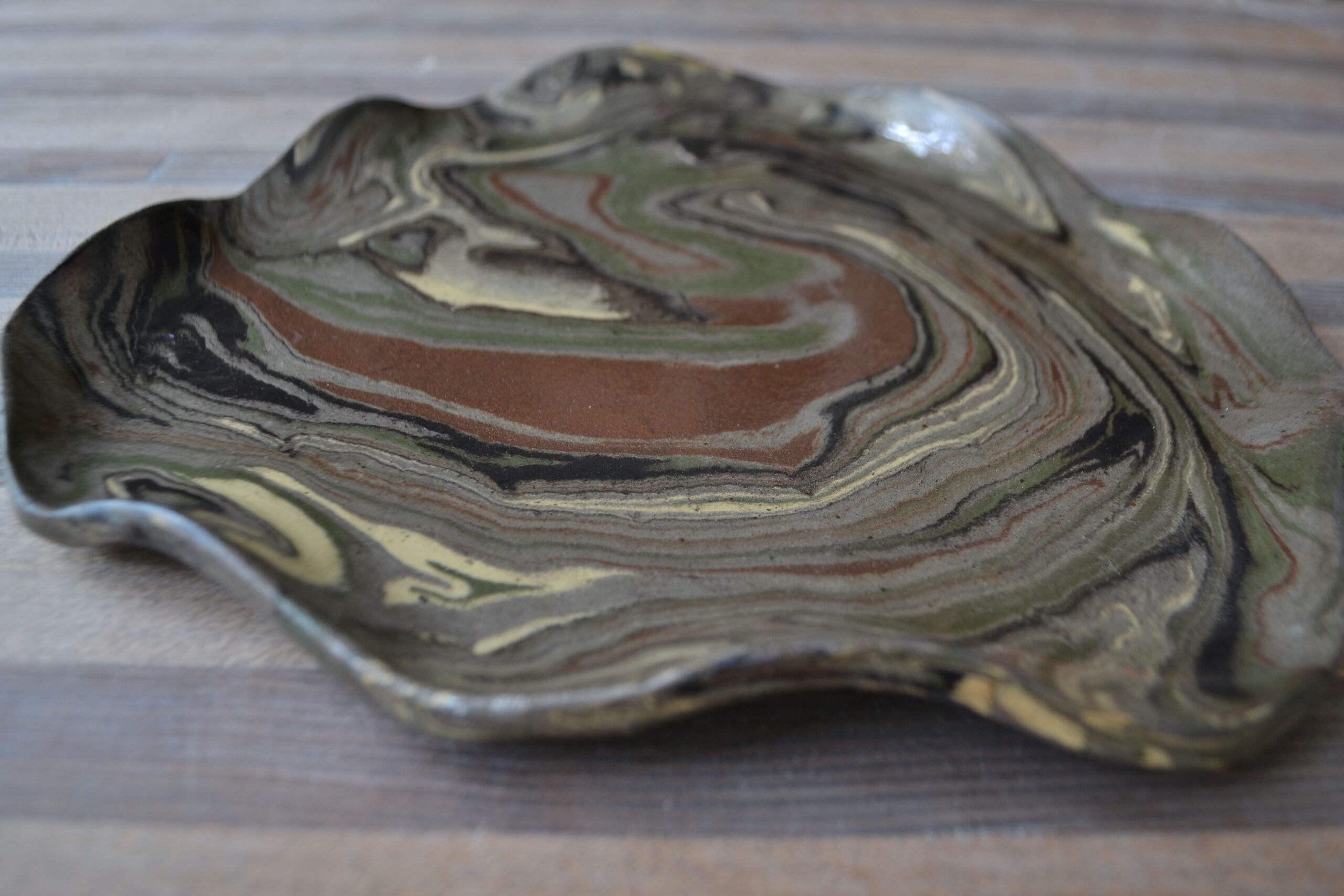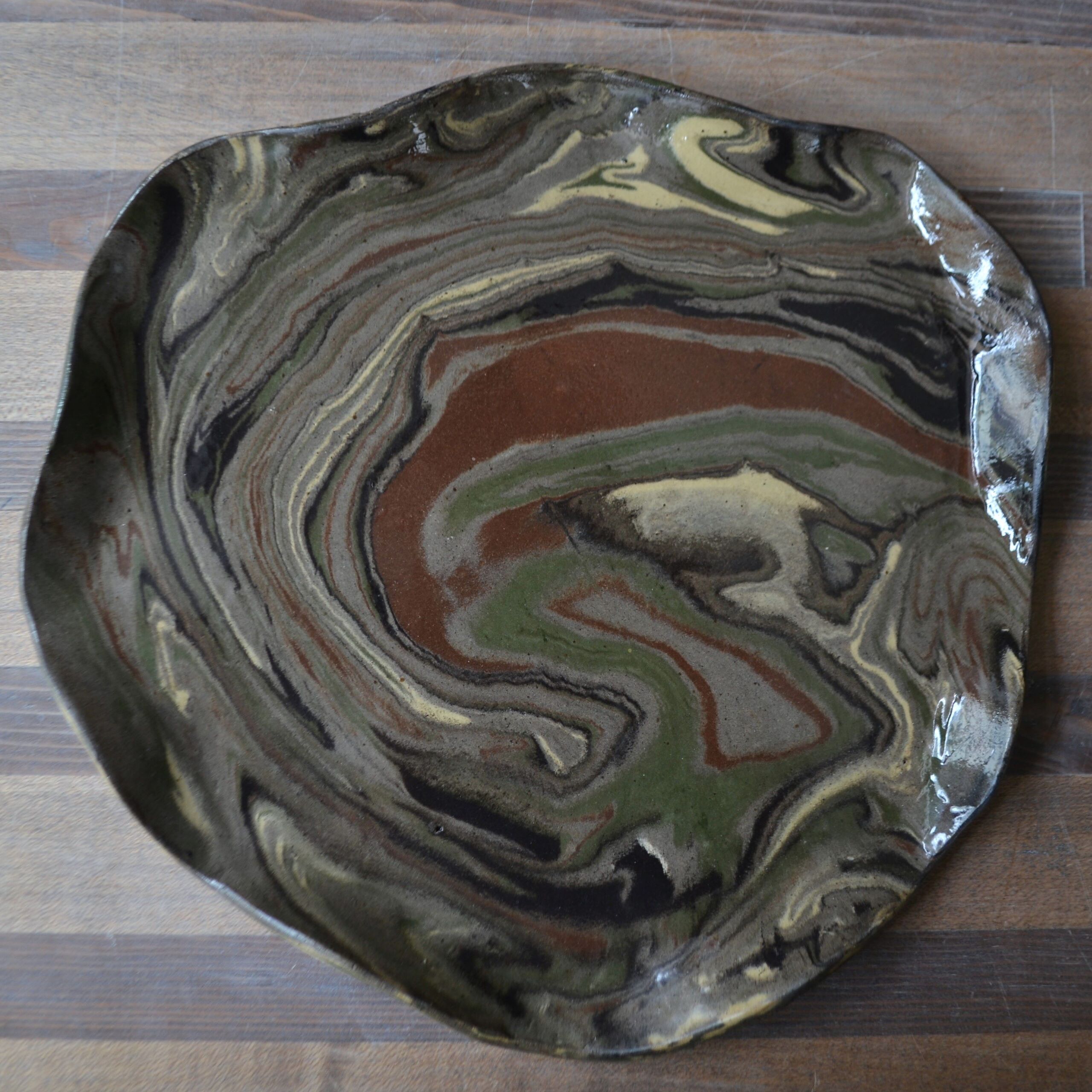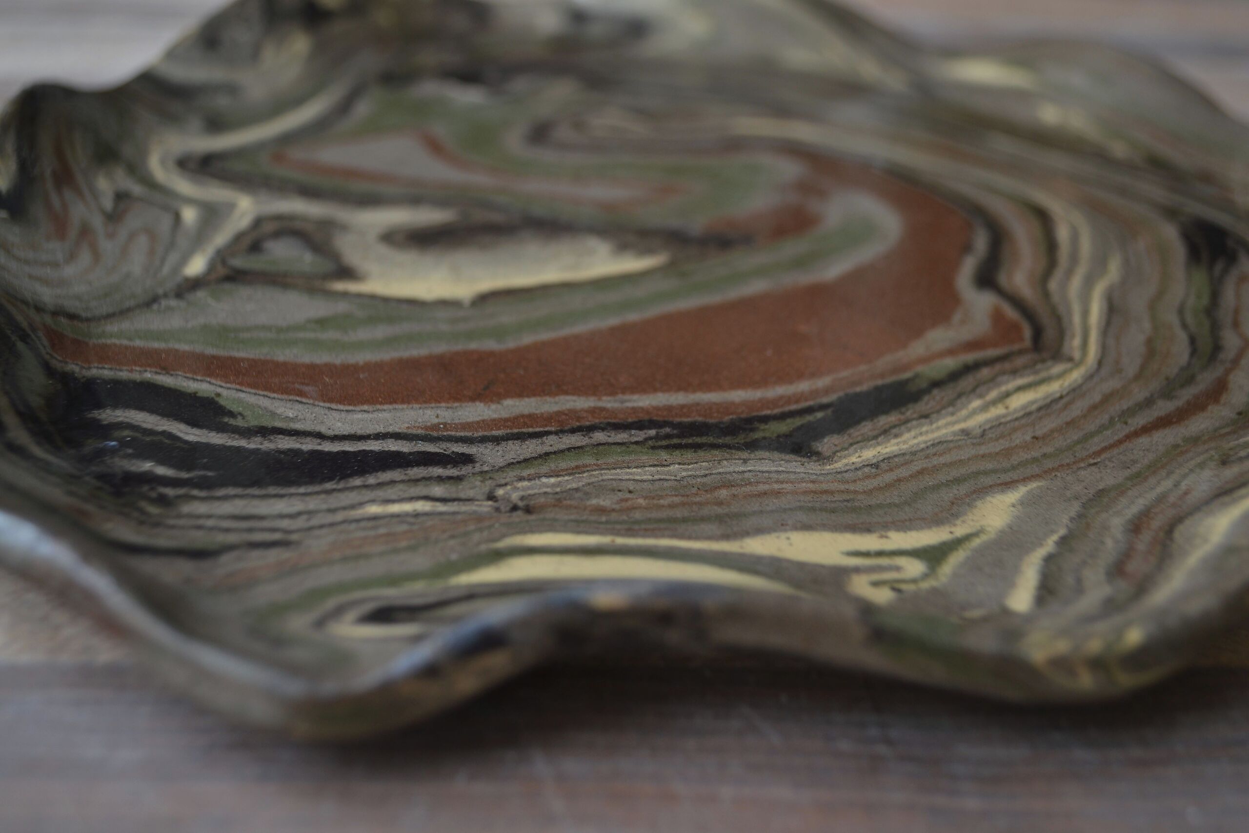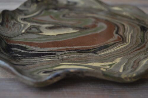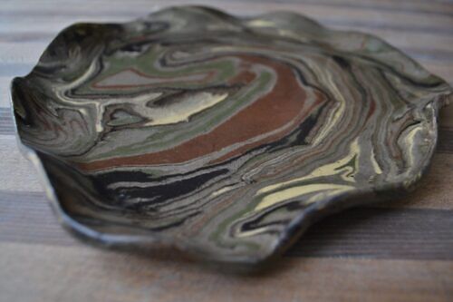 Patera ulepiona mieszanki glin o różnych kolorach, pokryta transparentnym szkliwem.