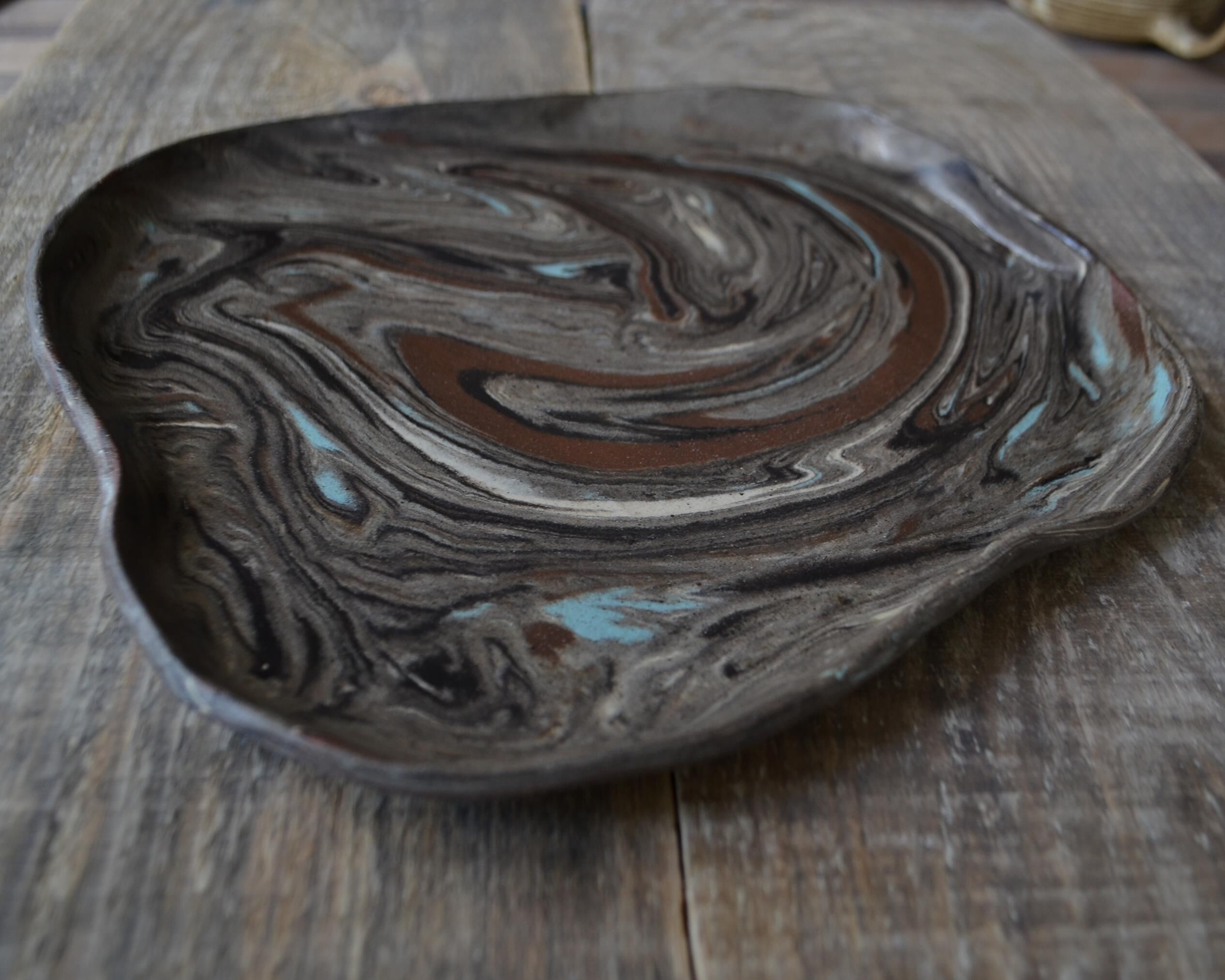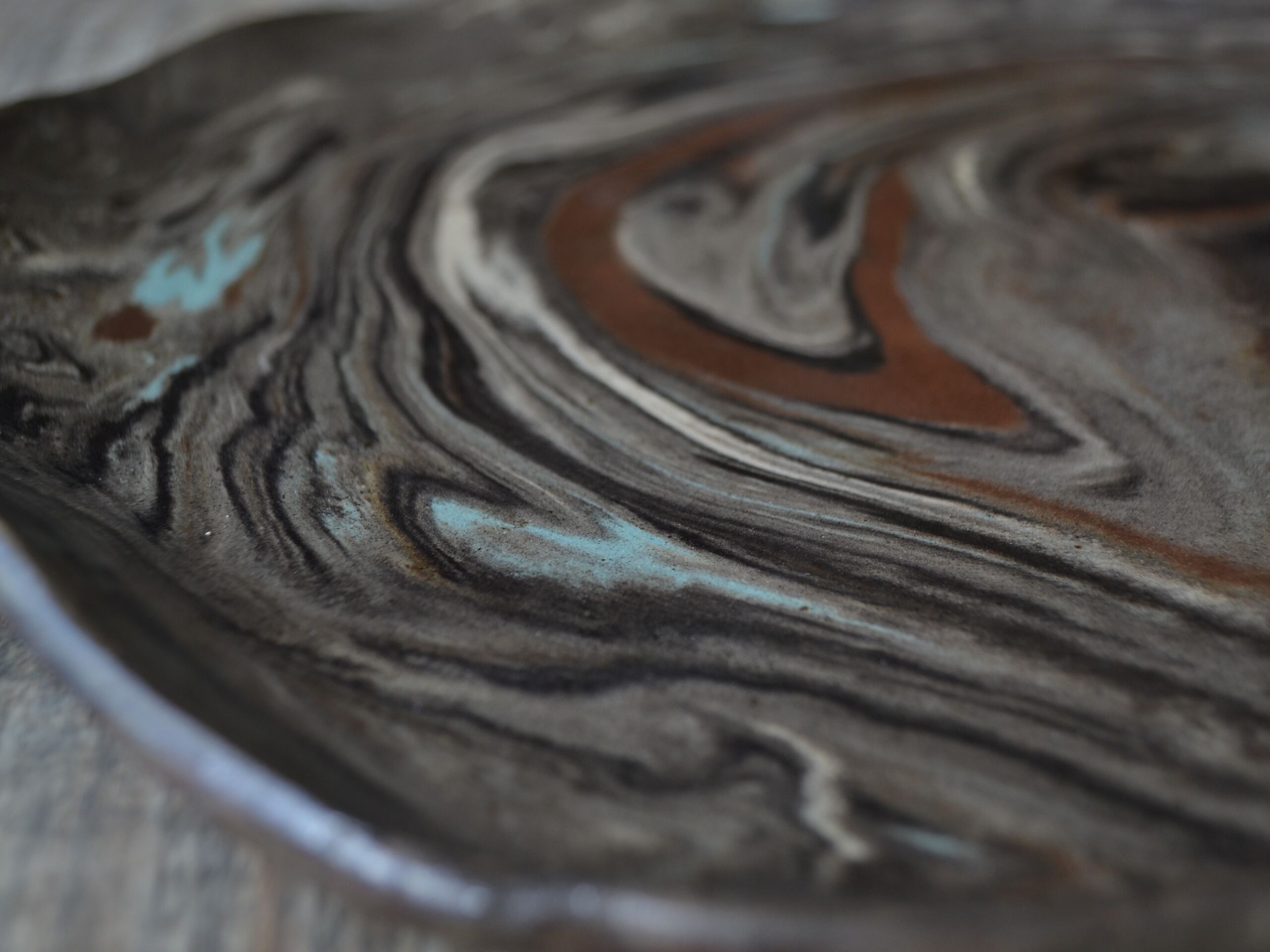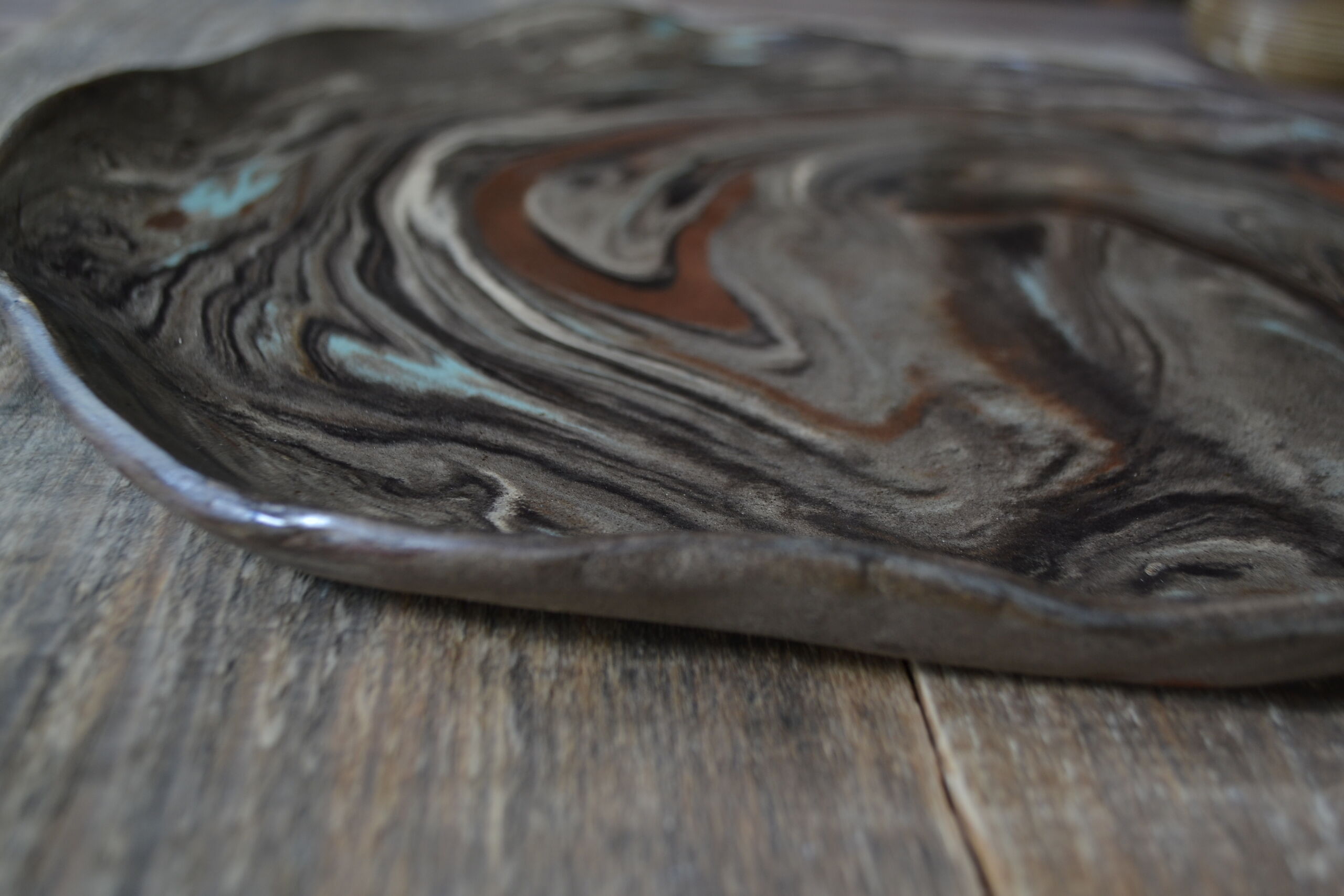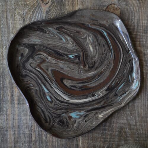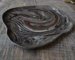 Patera wytoczona na kole garncarskim z szarej gliny, pokryta beżowym szkliwem.