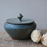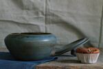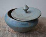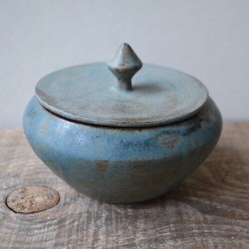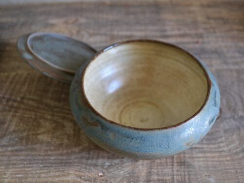 Naczynko wytoczone na kole garncarskim z szarej gliny. Pokryte satynowym szkliwem w odcieniach niebieskich i brązu. Wewnątrz pokryte jasnym szkliwem.