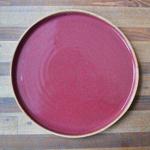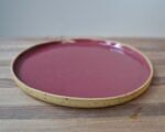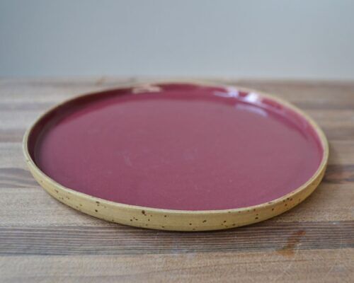 Talerz wytoczony na kole garncarskim z jasnej gliny w kropki, pokryty różowym szkliwem.
