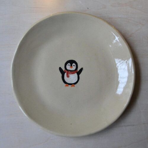 Talerz ulepiony z jasnej gliny. Ozdobiony rysunkiem pingwinka, pokryty transparentnym szkliwem.