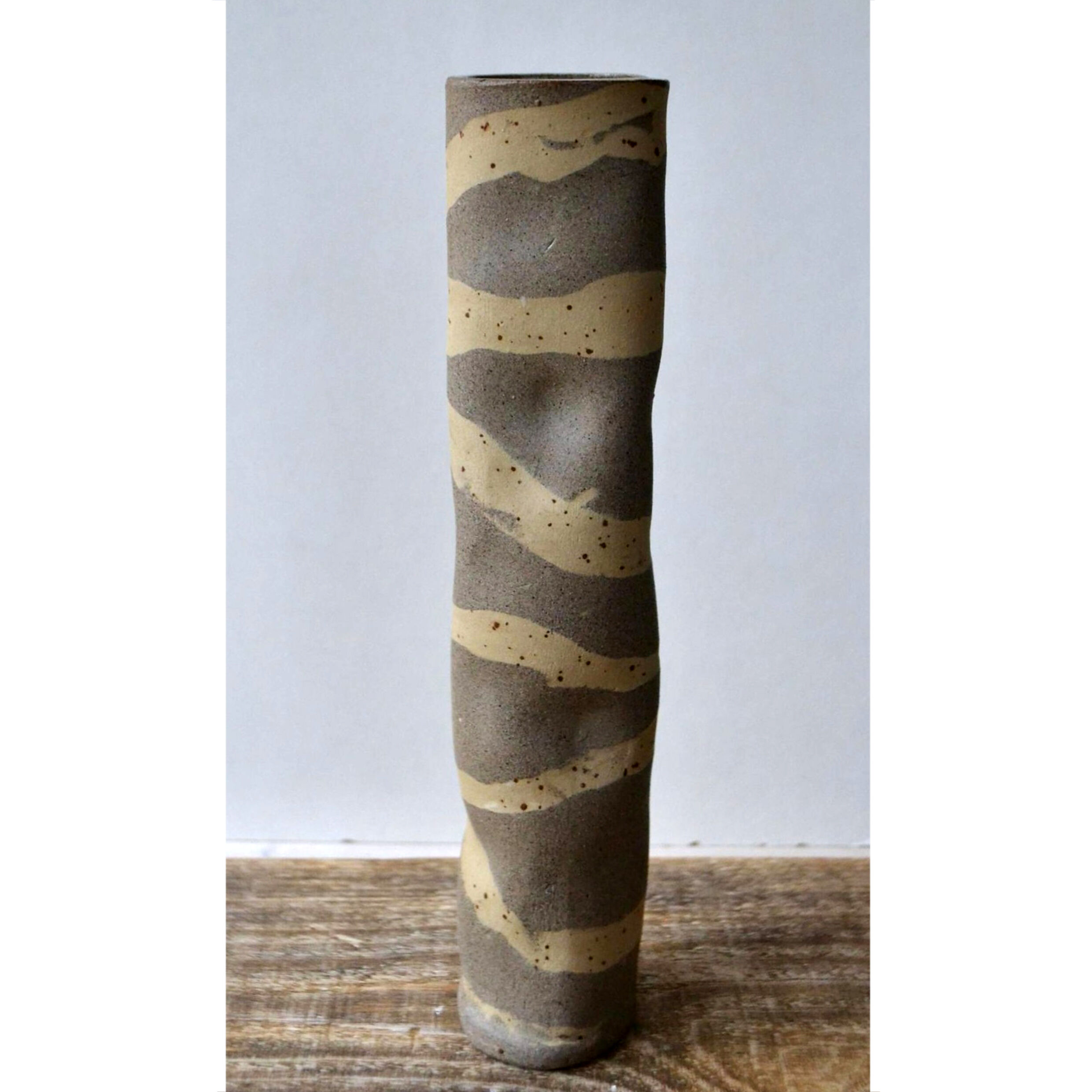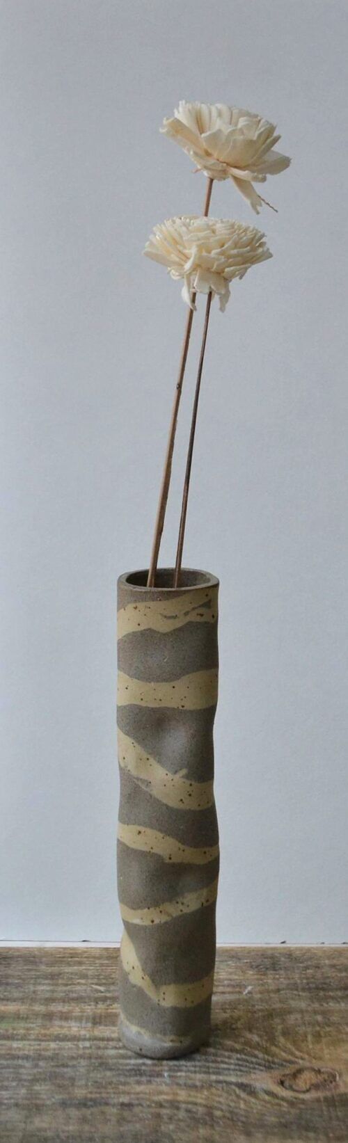 Wazon o nieregularnych kształtach z mieszanki dwóch glin: szarej i beżowej, pokryty szkliwem tylko wewnątrz.