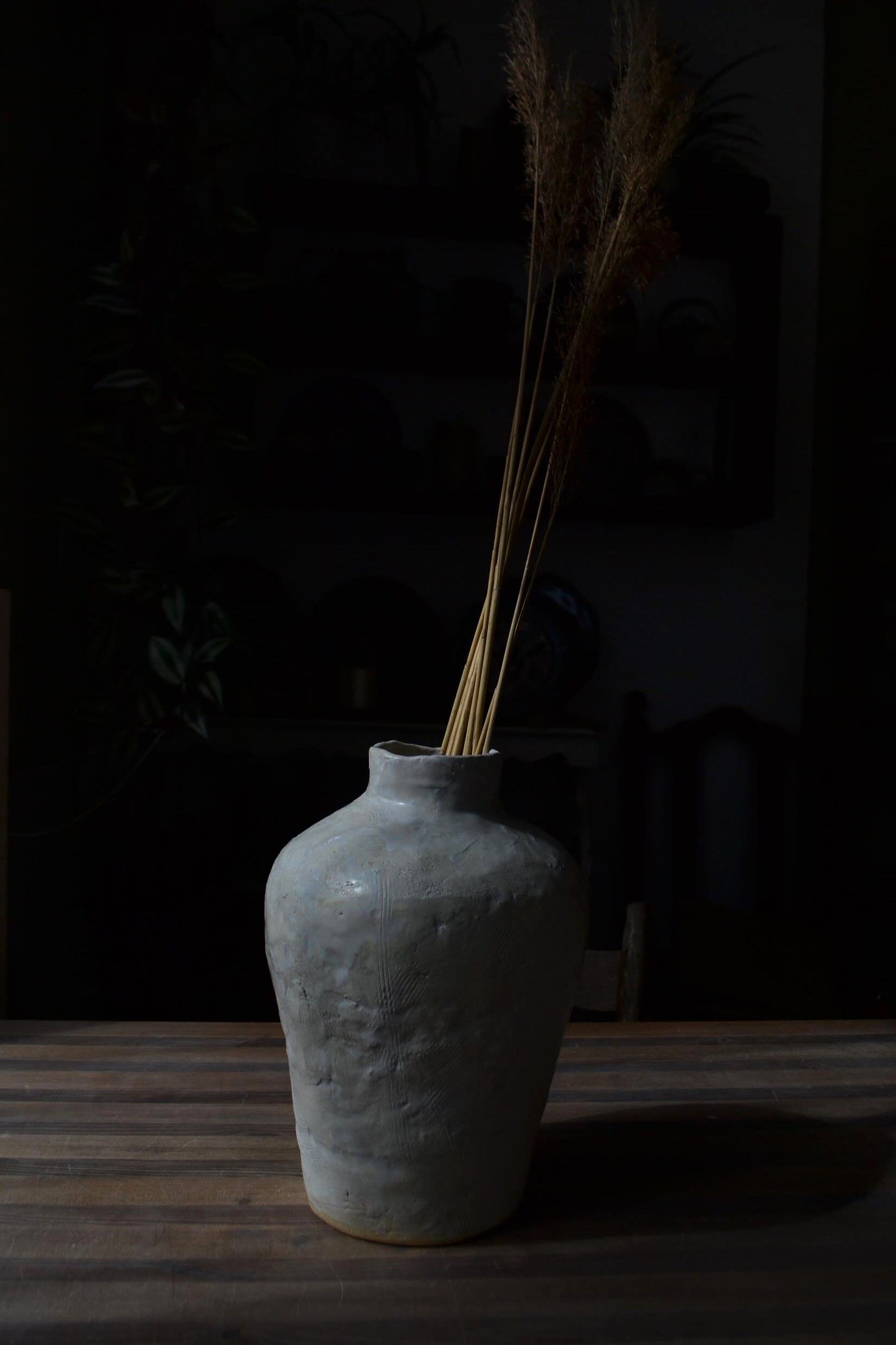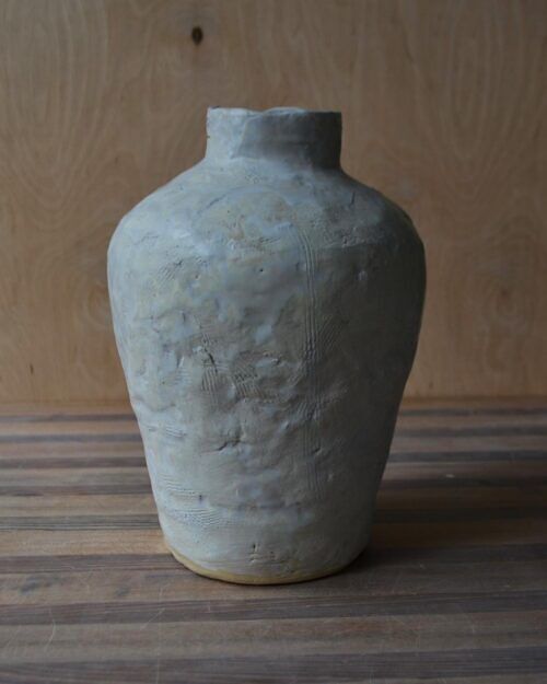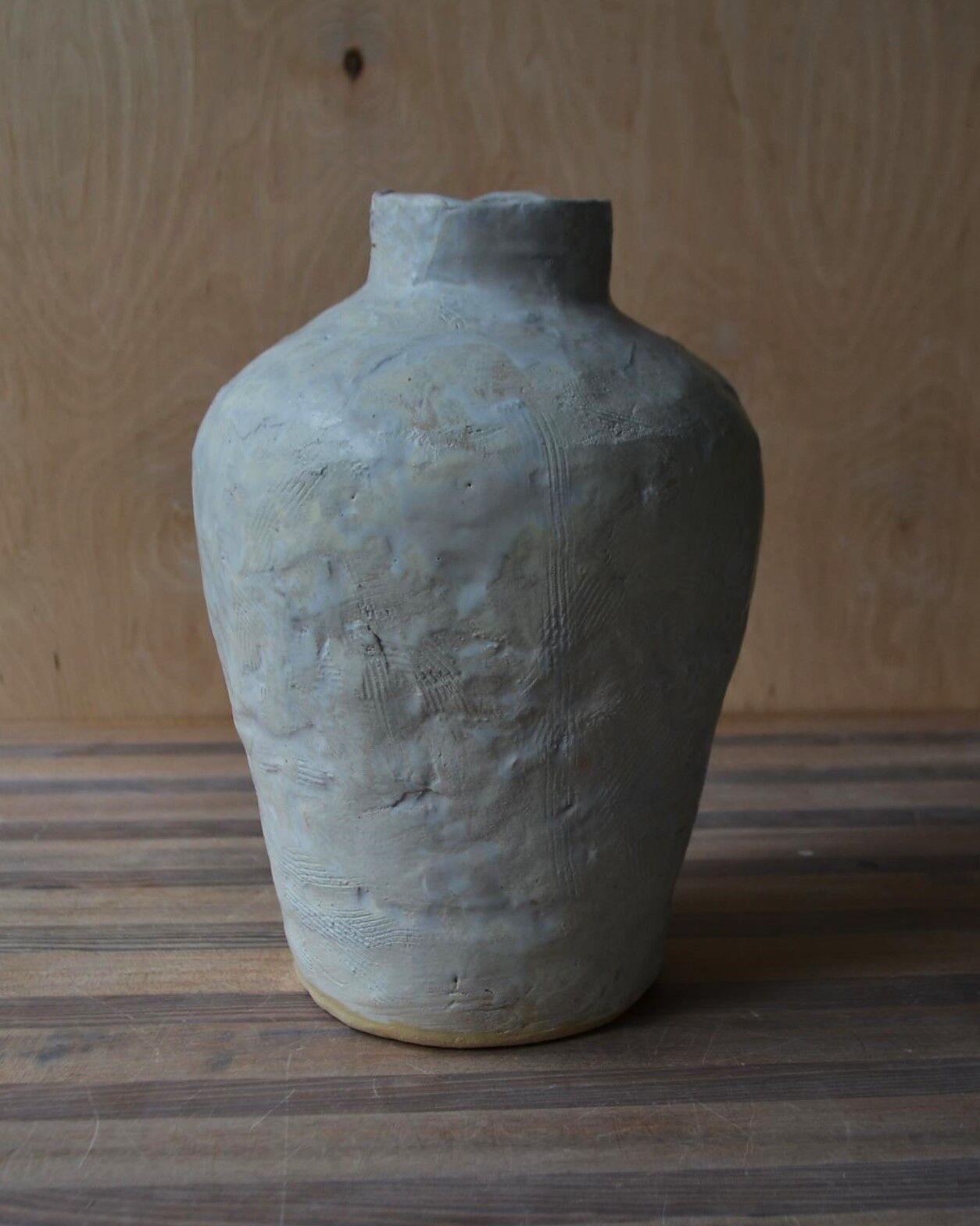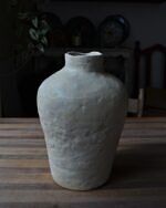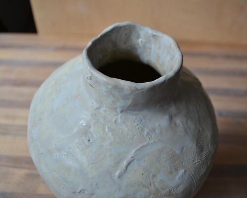 Wazon o nieregularnych kształtach z jasnej gliny lepiony ręcznie. Pokryty białym szkliwem.